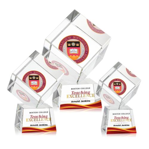 Of the Crystal Awards, this beautiful Burrill VividPrint™ Award on Robson Base - Clear is a great choice. (OPV6373-RC) A perfectly polished cube made from the purest Optical Crystal. Features a subtle single beveled edge all around. Let this recognition piece shine as an award, paperweight or momento for your desk or shelf. Complete with your choice of Clear, Ebony, Sapphire, or Emerald tapered Optical Crystal base. Let your message POP! with full color VividPrint.