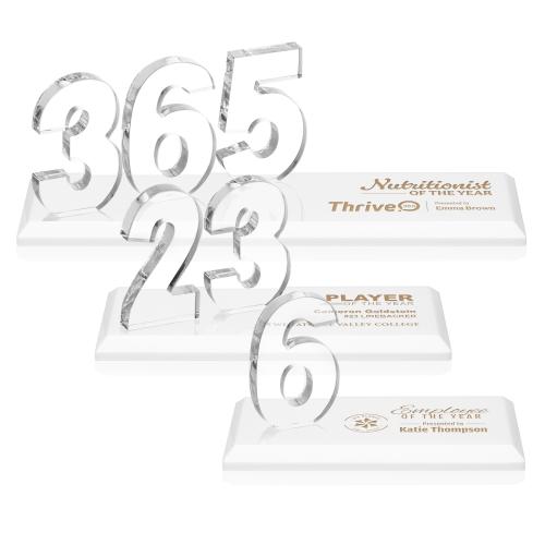 Of the Crystal Awards, this beautiful Northam Milestone Award - White is a great choice. (AWS6071-W) Celebrate an important milestone with the Northam Milestone Awards. Personalize the award with one, two, or three Starfire Crystal digits, allowing you to commemorate specific milestones, years of service, or any numerical achievement that deserves acknowledgment. Numbers sit atop your choice of clear or colored Optical Crystal base.