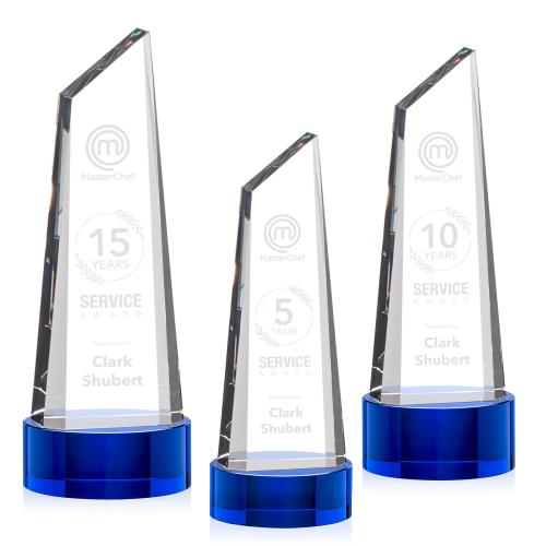 Of the Crystal Awards, this beautiful Akron Tower on Base - Blue is a great choice. (OPT1461-L) Stunning trapezoidal tower award is anchored with a thick optical crystal bottom that tapers to a peak. Mounted on your choice of Clear, Emerald, Ebony, or Sapphire Optical Crystal base. Experience a new glimmer of radiant light at each angle of this exquisite crystal award.