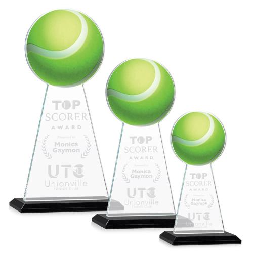 Of the Crystal Awards, this beautiful Edenwood Tennis Award - Black is a great choice. (AWS4501-TK) The Starfire Crystal Edenwood Award stands tall as a symbol of recognition for outstanding achievements in tennis, whether by individuals or teams. It serves as a versatile token of appreciation, suitable for commemorating tournaments, celebrating remarkable performances, or acknowledging the dedication of players, staff, and volunteers. Crafted with precision, its sleek design features symmetrical sloping sides culminating in the distinctive contour of a tennis ball at its peak. Mounted on a beveled base in your choice of 8 different colors and includes an imprinted tennis ball at the top of the award.