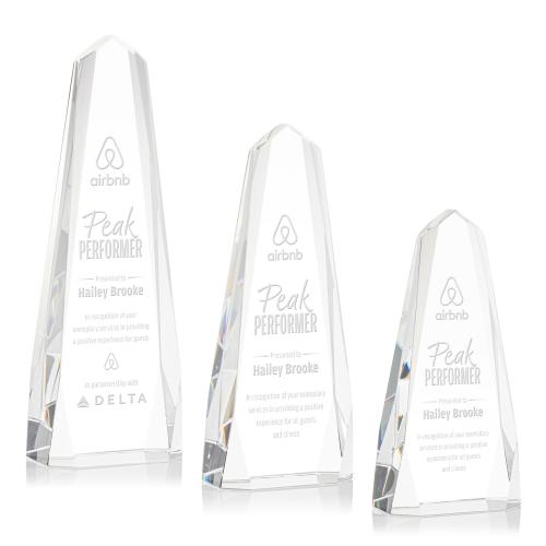 Of the Crystal Awards, this beautiful Geneva Award is a great choice. (OPT1281) The freestanding Optical Crystal Geneva Award is an obelisk that features a mesmerizing design with interchanging bevels, lending it a dynamic and captivating appearance. Each facet catches and reflects light, creating a dazzling display that symbolizes the multifaceted nature of success.