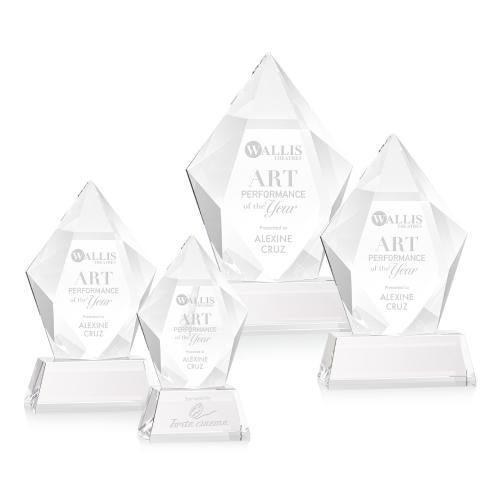 Of the Crystal Awards, this beautiful Devron Award on Base - Clear is a great choice. (OPT40361-C) The spectacular and sparkling Devron Award features a thick Optical Crystal pentagon with deep facets creating a halo for refracted light around your inspirational words of achievement. Mounted on a tall tapered optical base in your choice of 8 distinct colors. Second position etch and colorfill optional.
