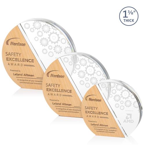 Of the Crystal Awards, this beautiful Kenyon Award is a great choice. (OPT5211) The freestanding Kenyon Award is the best of both worlds - a harmonious blend of sophistication and nature's beauty. Crafted with precision, its diagonal split design elegantly juxtaposes the brilliance of optical crystal with the warmth of beechwood. With a flat bottom for effortless display, this award stands as a timeless symbol of achievement and distinction.