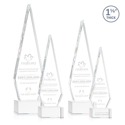 Of the Crystal Awards, this beautiful Springfield Award on Hancock Base - Clear is a great choice. (OPT1521-HC) This Optical Crystal Springfield Award on base features an elongated, tall diamond-shape, standing **1 3/8 inches thick.** The sleek design exudes elegance and sophistication, making it an eye-catching centerpiece for any display. Its flawless clarity and precision-cut edges reflect light beautifully, highlighting the craftsmanship and significance of the accolade. Available with various bases. 2nd position etching is optional.