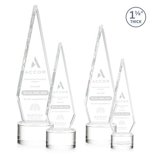 Of the Crystal Awards, this beautiful Springfield Award on Marvel Base - Clear is a great choice. (OPT1521-MC) This Optical Crystal Springfield Award on base features an elongated, tall diamond-shape, standing **1 3/8 inches thick.** The sleek design exudes elegance and sophistication, making it an eye-catching centerpiece for any display. Its flawless clarity and precision-cut edges reflect light beautifully, highlighting the craftsmanship and significance of the accolade. Available with various bases. 2nd position etching optional.