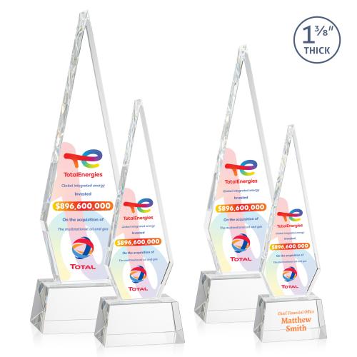 Of the Crystal Awards, this beautiful Springfield VividPrint™ Award on Robson Base - Clear is a great choice. (OPV1521-RC) This Optical Crystal Springfield VividPrint Award on base features an elongated, tall diamond-shape, standing **1 3/8 inches thick.** The sleek and freestanding design exudes elegance and sophistication, making it an eye-catching centerpiece for any display. Its flawless clarity and precision-cut edges reflect light beautifully, highlighting the craftsmanship and significance of the accolade. Bring your artwork to new heights with full-color VividPrint! Available with various bases. 2nd position etching optional.