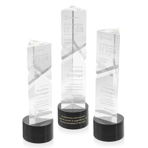 Of the Crystal Awards, this beautiful Oakham Award on Marvel Base - Black is a great choice. (OPT1221-MK) The Optical Crystal Oakham Award on base features a unique and striking design with deep, interchanging facets that catch and reflect light beautifully. Crafted from high-quality optical crystal, this award offers a sophisticated and elegant way to recognize exceptional achievements. Its unique triangular shape and impeccable clarity make it a standout piece for any ceremony or display. Second-position decoration on base optional.