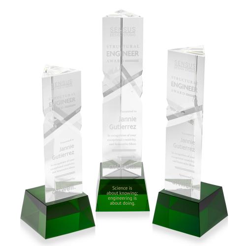 Of the Crystal Awards, this beautiful Oakham Award on Robson Base - Green is a great choice. (OPT1221-RG) The Optical Crystal Oakham Award on base features a unique and striking design with deep, interchanging facets that catch and reflect light beautifully. Crafted from high-quality optical crystal, this award offers a sophisticated and elegant way to recognize exceptional achievements. Its unique triangular shape and impeccable clarity make it a standout piece for any ceremony or display. Second-position decoration on base optional.