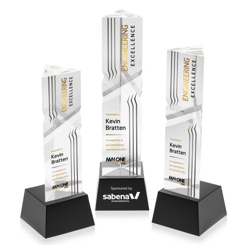 Of the Crystal Awards, this beautiful Oakham VividPrint™ Award on Robson Base - Black is a great choice. (OPV1221-RK) The Oakham VividPrint Award on base features a unique and striking design with deep, interchanging facets that catch and reflect light beautifully. Crafted from high-quality optical crystal, this award offers a sophisticated and elegant way to recognize exceptional achievements. Its unique triangular shape and impeccable clarity make it a standout piece for any ceremony or display. Take your artwork to new heights with full-color VividPrint! Second-position decoration on base optional.