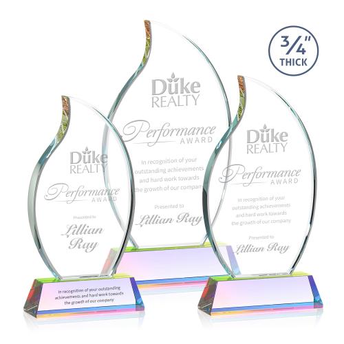 Of the Crystal Awards, this beautiful Croydon Flame Award on Newhaven Base - Prismatic is a great choice. (AWS17451-M) The Croydon award features an elegant 3/4" thick Starfire Crystal flame to commemorate your achievement with an eternal symbol of greatness. Mounted on your choice of 9 sparkling colored Newhaven bases. Second position etch optional.