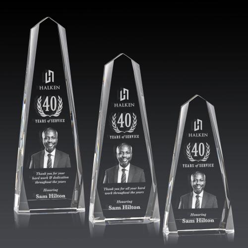 Of the Crystal Awards, this beautiful Geneva 3D Award is a great choice. (OPD1281) The freestanding Optical Crystal Geneva 3D Award is an obelisk that features a mesmerizing design with interchanging bevels, lending it a dynamic and captivating appearance. Each facet catches and reflects light, creating a dazzling display that symbolizes the multifaceted nature of success. Take our deep etch process even deeper with our incredible subsurface Dimensions 3D Engraving.