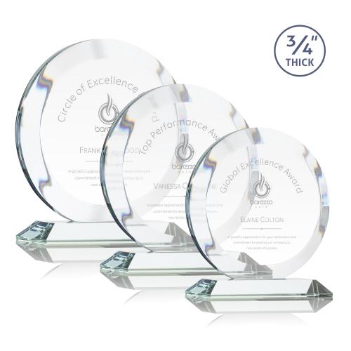 Of the Crystal Awards, this beautiful Gibralter Award - Clear is a great choice. (AWS1721) The Gibralter is a perfect 3/4" thick Starfire circle framed by a soft beveled edge that highlight your words of achievement. Mounted on beautifully mitered base in your choice of 8 distinct colors.