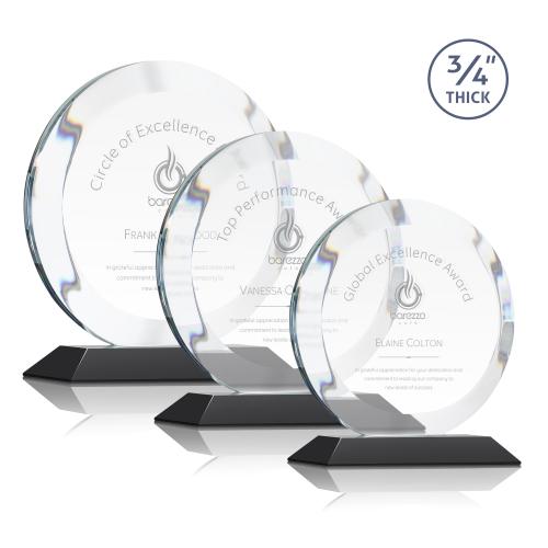 Of the Crystal Awards, this beautiful Gibralter Award - Black is a great choice. (AWS1721-K) The Gibralter is a perfect 3/4" thick Starfire circle framed by a soft beveled edge that highlight your words of achievement. Mounted on beautifully mitered base in your choice of 8 distinct and vivid colors.