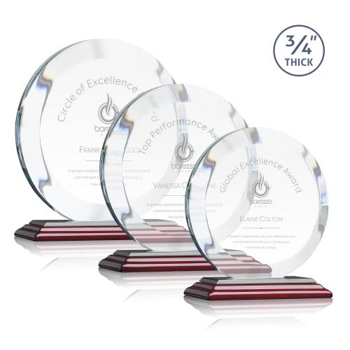 Of the Crystal Awards, this beautiful Gibralter Award - Rosewood is a great choice. (AWS1721-N) The Gibralter is a perfect 3/4" thick Starfire circle framed by a soft beveled edge that highlight your words of achievement. Mounted on triple-stepped piano finished rosewood Albion base.