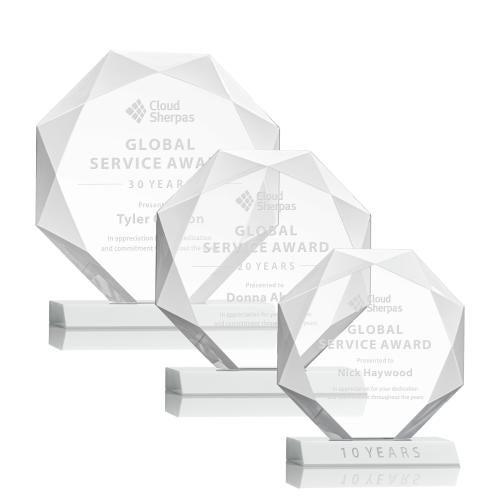 Of the Crystal Awards, this beautiful Kitchener Award - White is a great choice. (AWS2441-W) Striking Starfire Octagon award refracts light through all of its facets creating a brilliant display for achievement recognition. Available in 3 sizes and 10 different colored bases.