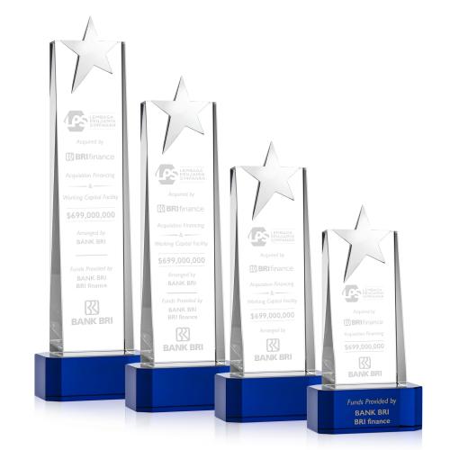 Of the Crystal Awards, this beautiful Fanshaw Silver Star Award on Base - Blue is a great choice. (OPS851-SL) The Fanshaw Optical Star Award is a spectacular recognition piece for an outstanding achievement. Crowned with a high polished chrome star and mounted on an extra-thick Optical Base to create a grandiose crystal tower to commemorate your success. Second Position Etch Optional.