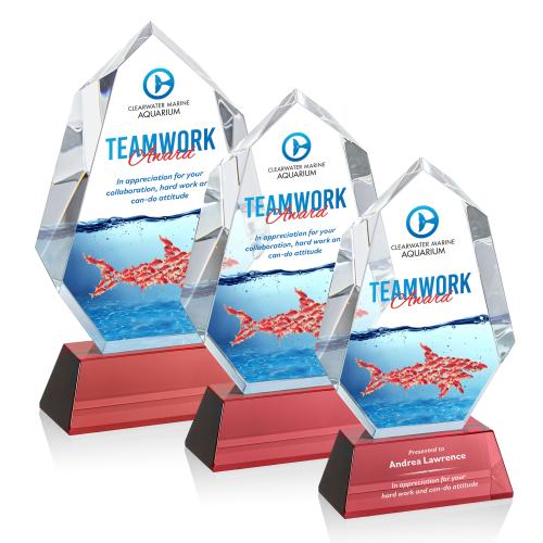 Of the Crystal Awards, this beautiful Norwood VividPrint™ Award on Newhaven Base - Red is a great choice. (OPV48551-R) This extra-thick Optical Norwood VividPrint Award on a tall Crystal Newhaven base makes a bold statement when awarded to a deserving recipient. With dramatic interchanging bevels, the Norwood award will refract light in every direction to create a sparkling spotlight around your recognition message. Mounted on your choice of clear or colored Optical Crystal base. Second Position Etch & Colorfill optional.
