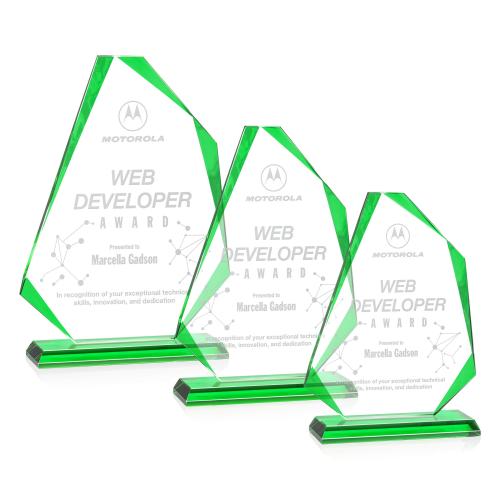 Of the Crystal Awards, this beautiful Hillmont Award - Green is a great choice. (AWS8201-G) The Hillmont Award, crafted from brilliant Starfire crystal, features an abstract polygon design with striking colored edges that seamlessly match its sturdy base. Perfect for honoring top achievers and industry leaders, this award embodies excellence and innovation. The award is available in sapphire, emerald, ruby, or gold.