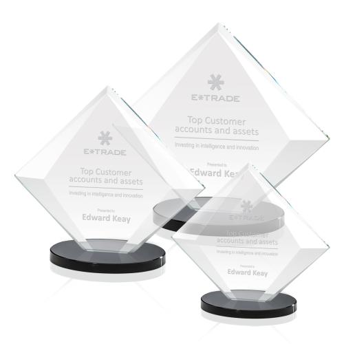 Of the Crystal Awards, this beautiful Teston Award - Black is a great choice. (AWS6901-K) The striking bevels of the diamond-shaped Teston taper uniformly from the midpoint to both bottom and peak. These produce brilliant reflections along the borders of the 3/8" starfire upright and beautifully frame the central etching area. A circular, straight-edged black base completes the piece.