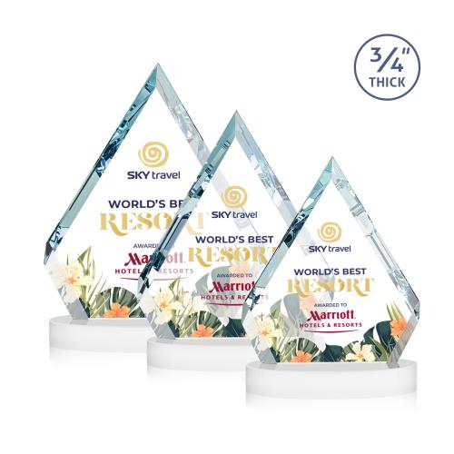 Of the Crystal Awards, this beautiful Apex VividPrint™ Award on Alberton Base - White is a great choice. (AWV13061-W) The sparkling Apex award features a 0.75" thick Starfire Crystal diamond with interchanging bevels that illuminate the inscription within. Mounted on an oval Alberton Crystal Base, the striking Apex award is the pinnacle of achievement recognition. Let your message POP with full color VividPrint.