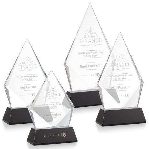 Of the Crystal Awards, this beautiful Shelton Award on Newhaven Base - Black is a great choice. (OPT2761-NK) The Optical Crystal Shelton Award on Newhaven base features a striking diamond shape with an elongated peak, symbolizing excellence and ambition. With polished bottom bevels, it makes a bold and elegant statement of achievement. Mounted on a tall tapered optical crystal base.