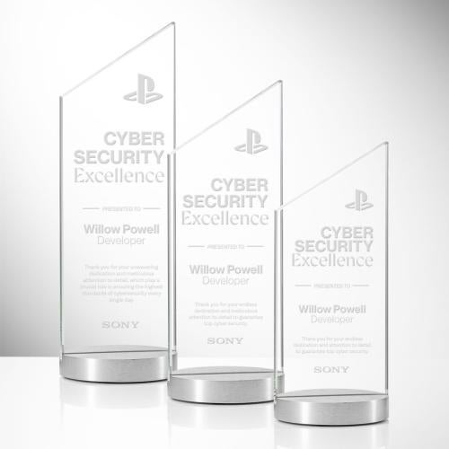 Of the Crystal Awards, this beautiful Islington Award is a great choice. (AWS4971) The Islington Award showcases a sleek, modern design with a crisp top-right facing peak, symbolizing upward achievement and forward momentum. Crafted from luminous Starfire crystal, it offers exceptional clarity and elegance, perfect for highlighting your custom message. Mounted on a round aluminum base, this award brings a contemporary touch to any recognition moment.