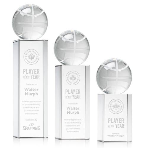 Of the Crystal Awards, this beautiful Basketball Award on Dakota Base is a great choice. (OPT8543-DK1) Our Basketball Award is a tribute to the athleticism and dedication of basketball enthusiasts. At the heart of this masterpiece is a flawlessly rendered Optical Crystal Basketball that captures and refracts light in a captivating display. Mounted on a complimenting Optical base for personalization with a Logo or Name. An outstanding award, gift, or keepsake for basketball tournaments, competitions, or special occasions.
