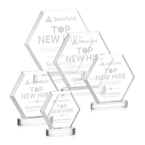 Of the Crystal Awards, this beautiful Barnett Award on Alberton Base - Clear is a great choice. (AWS33771) The Barnett Award features a beautifully beveled Starfire Crystal Hexagon mounted on an oval Alberton base in your choice of 9 distinct colors. The large decorating area is highlighted by the deep mitered edges that frame your outstanding achievement with refracted light.