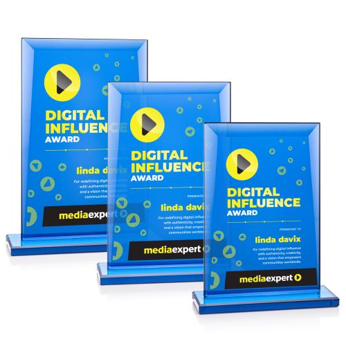 Of the Crystal Awards, this beautiful Martello VividPrint™ Award is a great choice. (AWLV3211) The all-blue Martello VividPrint Award is a striking symbol of prestige and achievement. Its sleek, tapered design features finely beveled edges that catch and reflect the light, creating a brilliant display from every angle. Mounted on a sturdy blue rectangular base, this award exudes timeless elegance and professionalism. Perfect for honoring excellence in any industry, the Martello is an ideal choice for employee recognition, milestone achievements, and distinguished service awards. Its refined style ensures it will be proudly displayed and cherished for years to come. Bring your artwork to life with full-color VividPrint!