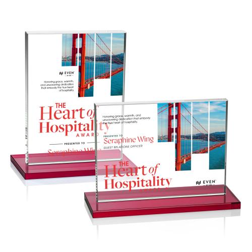 Of the Crystal Awards, this beautiful Emperor VividPrint™ Award - Red (Horiz) is a great choice. (AWV2602-HR) The Emperor VividPrint Award is a simple yet elegant 0.5" thick Starfire Crystal rectangle upright mounted vertical or horizontal on a beveled Starfire base. An ideal award featuring a large decorating area to recognize a significant achievement.