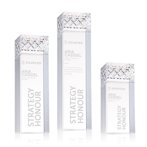 Of the Crystal Awards, this beautiful Velson Award is a great choice. (OPT3061) The Velson Award is a striking freestanding optical crystal piece with a tall rectangular column that conveys strength and prestige. Its top features a beautifully cut diamond-patterned design that sparkles with light, adding texture and brilliance to the sleek crystal body.