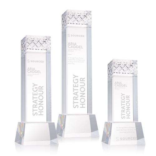 Of the Crystal Awards, this beautiful Velson Award on Base - Clear is a great choice. (OPT3061-C) The Velson Award on Base is a striking optical crystal piece with a tall rectangular column that conveys strength and prestige. Its top features a beautifully cut diamond-patterned design that sparkles with light, adding texture and brilliance to the sleek crystal body. Resting on a bold crystal base, this award combines elegance and vibrancy, making it a memorable symbol of achievement.