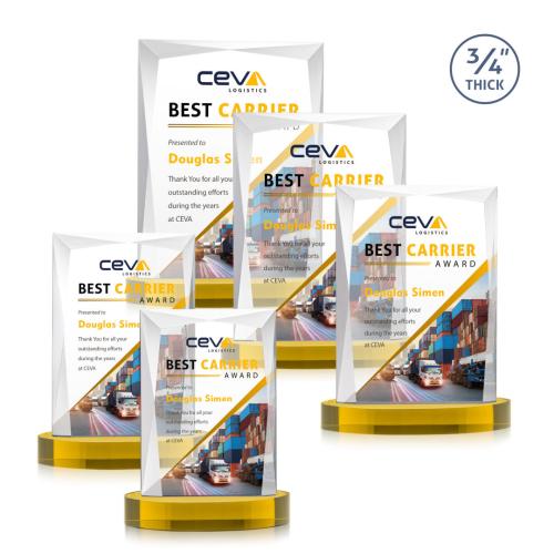Of the Crystal Awards, this beautiful Messina VividPrint™ Award on Alberton Base - Gold is a great choice. (AWV17081-D) A staple of the recognition industry, the Messina on Alberton Base is a striking award in thick 3/4" Starfire Crystal mounted on clear or colored base. Featuring brilliant interchanging bevels that create a beautiful frame of refracting light for your special achievement. Let your message POP with full color VividPrint!