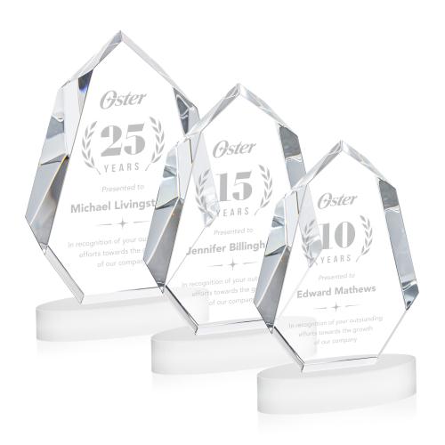 Of the Crystal Awards, this beautiful Norwood Award on Alberton Base - White is a great choice. (OPT48561-W) This extra-thick Optical Crystal work of recognition art makes a bold statement when awarded to a deserving recipient. With dramatic interchanging bevels, the Norwood award will refract light in every direction to create a sparkling spotlight around your recognition message. Mounted on an oval Alberton Base.