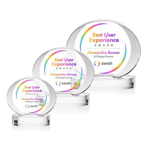 Of the Crystal Awards, this beautiful Sheraton VividPrint™ Award on Base - Clear is a great choice. (OPV47061) The Sheraton Oval VividPrint Award on Base features a sleek, concave oval design with a striped, ridged edge that creates a refined fanfare around the imprint area. Its layered detailing adds depth while elegantly highlighting your personalized message or logo. Mounted on a solid base, this award offers a polished and contemporary way to honor achievement.