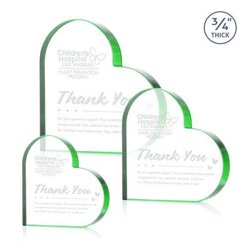 Of the Crystal Awards, this beautiful Davina Heart Award - Green is a great choice. (DSS2561-G) The Davina Heart Award is a freestanding, .75â³-thick Starfire crystal award featuring a graceful heart silhouette and polished edges that catch and reflect light beautifully. Its substantial crystal form conveys both elegance and permanence, making it ideal for heartfelt recognition and donor appreciation. Available with gold, emerald, ruby, or sapphire edge accents, it offers a meaningful way to celebrate generosity and achievement with a touch of color.