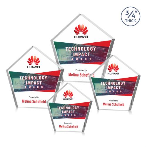 Of the Crystal Awards, this beautiful Belmar Pentagon VividPrint™ Award - Clear is a great choice. (DSV2541) The Belmar Pentagon VividPrint Award is a freestanding, .75â³-thick Starfire crystal award featuring a modern pentagon silhouette with crisp, precision-cut edges. Its substantial crystal construction provides a bold canvas for full-color graphics and custom branding, making it ideal for corporate and technology recognition. Available with clear or colored edge accents, this award delivers a contemporary look that highlights innovation, impact, and achievement.