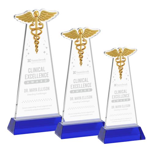 Of the Crystal Awards, this beautiful Caduceus Award on Hartford Base - Blue is a great choice. (AWS44461-L) The Caduceus Award is crafted from premium Starfire crystal and features a finely detailed Caduceus figure elegantly imprinted at the top, symbolizing care, knowledge, and healing. Its sleek, tapered design and brilliant clarity create a striking presentation that reflects both professionalism and prestige. Ideal for recognizing excellence in healthcare, medical, pharmaceutical, and wellness industries, this award is especially suited for physicians, nurses, clinicians, researchers, and healthcare leaders. A meaningful and distinguished tribute, the Caduceus Award honors those dedicated to advancing health and patient care. Mounted on a tall tapered Hartford base. Second Position Etch & Colorfill Optional.
