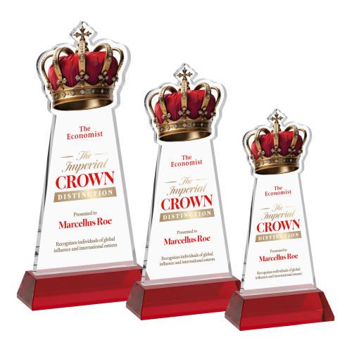 Of the Crystal Awards, this beautiful Crown VividPrint™ Award on Hartford Base - Red is a great choice. (AWV44061-R) The Crown VividPrint Award is a refined symbol of leadership and excellence, featuring a finely detailed crown figure elegantly imprinted at the top. Mounted on a clear or colored Starfire Crystal side-tapered Hartford base, it offers exceptional clarity and a modern, regal presentation. Its sleek design provides ample space for custom engraving, making it ideal for recognizing outstanding achievements and milestones. Suitable for any industry, the Crown Award delivers a timeless and prestigious way to honor success. Make your logo POP! with full-color VividPrint! Second position imprint is optional.