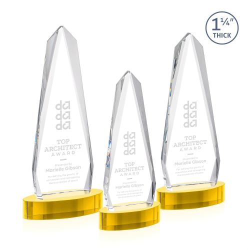 Of the Crystal Awards, this beautiful Cheswick Award on Alberton Base - Gold is a great choice. (OPT32761-D) The Cheswick Award on Base showcases a sleek optical crystal tower with polished facets that reflect light for a brilliant, refined presentation. The award is securely mounted on an oval Alberton crystal base, adding stability while enhancing its elegant, contemporary profile. With ample space for custom engraving, this striking piece creates a sophisticated tribute to exceptional achievements and milestones.