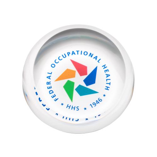 Of the Crystal Paperweights, this beautiful Slanted VividPrint™ Paperweight is a great choice. (PWV351) This round 3.5" Slanted VividPrint Paperweight in pure optical crystal features gently sloping sides and a slanted top surface. Let your message POP! with full-color VividPrint.
