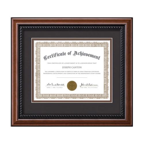 Of the Certificate Frames, this beautiful Weyden is a great choice. (PFN9617-132) The rich mahogany finish of the Weyden certificate wood frame is enhanced with an ebony stained carved rope accent. The wood frame is enhanced with a double matte of dove grey and navy to display your certification with old world charm.