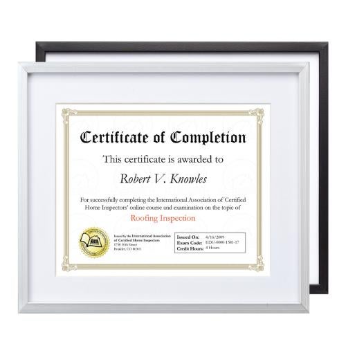 Of the Certificate Frames, this beautiful Burnell Certificate Frame is a great choice. (PFN9371) The Burnell certificate frame series features either a silver or black slim metal frame with a generous white matte center to give your document a dignified presence on any wall.