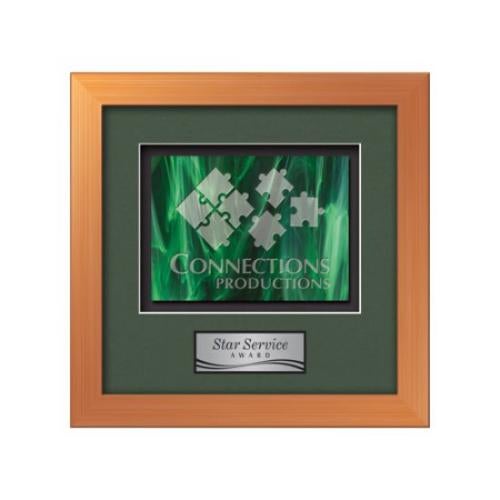 Of the Framed Awards & Plaques, this beautiful Eldridge - Bronze is a great choice. (WLS-11B-H1) This dazzling new collection of Stained Glass Framed Awards is inspired by the romance of spectral light streaming through the color-glazed windows of a magnificent cathedral. When combined with our exquisite Eldridge molding, your choice of 2 standard mattes and a personalization plate, this work of recognition will give any achievement a classic, refined appearance. Stained Glass available in Black, Blue, Red & Green. Please note that the nature of this product may result in occasional flow lines, different color hues and air bubbles that add to the allure of stained glass and are not considered defects.