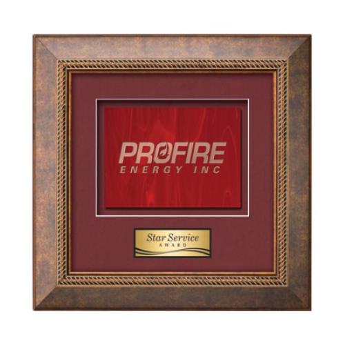 Of the Framed Awards & Plaques, this beautiful Lazio - Antique Bronze is a great choice. (WLS-23B-S1) This dazzling new collection of Stained Glass Framed Awards is inspired by the romance of spectral light streaming through the color-glazed windows of a magnificent cathedral. When combined with our exquisite Lazio molding, your choice of 2 standard mattes and a personalization plate, this work of recognition will give any achievement a classic, refined appearance. Stained Glass available in Black, Blue, Red & Green. Please note that the nature of this product may result in occasional flow lines, different color hues and air bubbles that add to the allure of stained glass and are not considered defects.