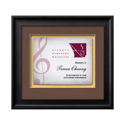 Of the Framed Awards & Plaques, this beautiful Yorktech Certificate Frame is a great choice. (WLTC-05K-V1) Commemorate a milestone achievement with Waterleaf Studios' Certificate collection. Honor years of service, display diplomas, service awards, company mission statements, mergers & acquisitions or extraordinary achievements with these impressive statements of accomplishment. Your words of recognition are reproduced in full color on handcrafted artisan paper with your choice of 2 standard mattes and framed in our museum quality Yorktech molding.
