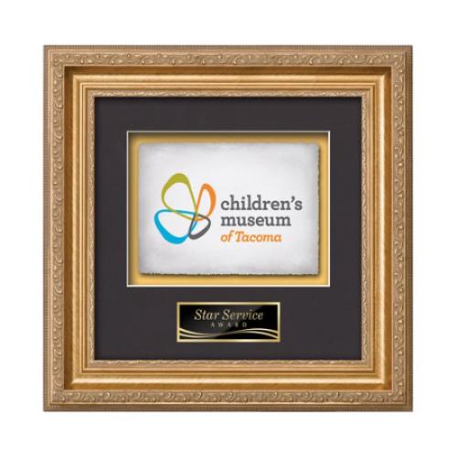 Of the Framed Awards & Plaques, this beautiful Regal - Gold is a great choice. (WLVC-31G-V1) Waterleaf Studios special VividPrint process precisely replicates your full color artwork onto handcrafted artisan paper. Combining the vintage, old world look and feel of handcrafted paper with the vibrant VividPrint process creates a truly unique and dynamic statement of achievement. Framed with our museum quality Regal molding, your choice of 2 standard mattes and a personalization plate.