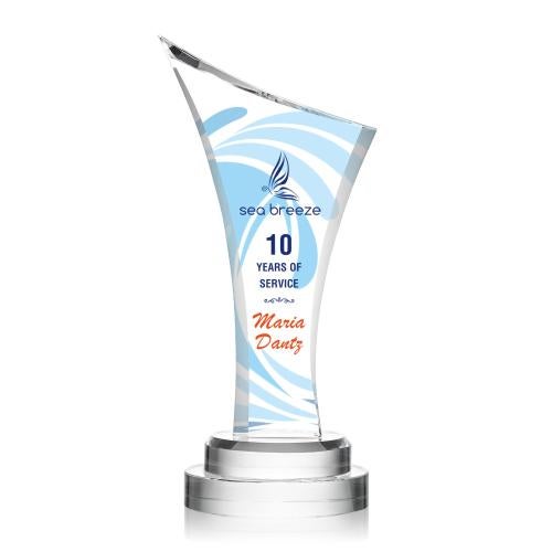 Of the Full Color Awards, this beautiful Huntley VividPrint™ Award is a great choice. (OPV9521) This bold award builds momentum from its double optical base into outstretching beveled sides that climb to two points along the top. Let your message POP with full color VividPrint!