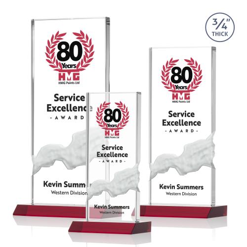 Of the Full Color Awards, this beautiful Poole VividPrint™ Award - Red is a great choice. (AWV3231-R) The striking Starfire Crystal Poole Award features a .75" thick Vertical Upright with a deep carved cascading waterfall effect sculpted right into the award. Mounted on an Ruby Red polished front mitered base, these unique awards add a contemporary twist to traditional corporate recognition.