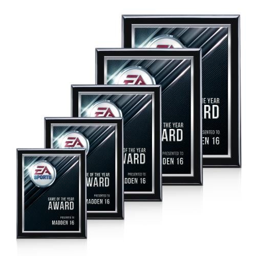 Of the Full Color Plaques, this beautiful Oakleigh VividPrint™ 3D Plaque - Black/White is a great choice. (AWP412-1542) The 3D VividPrint imprint builds a stunning dimensional layer on top of our white metal plate with silver edging, for a deep surface texture that can actually be felt. The Oakleigh displays our 3D imprint on a black piano finish wood plaque.